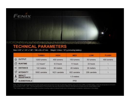Doseže zavidljivih 1200 lumnov svetilnosti. Vodoodporna po standardu IPX-8. Svetilka ima ojačano ultra-čisto dvojno lečo z anti - reflektivno prevleko proti odsevu in Premium Type HAIII anodiziran premaz proti rjavenju. Prav tako ima elektronsko regulirano svetilnost.