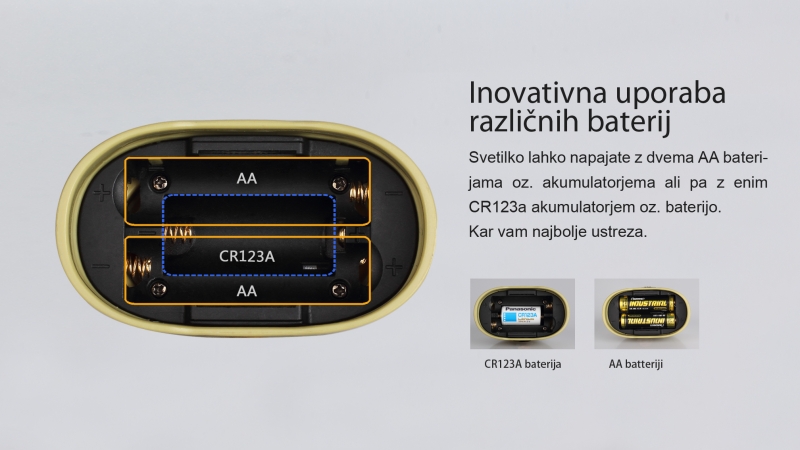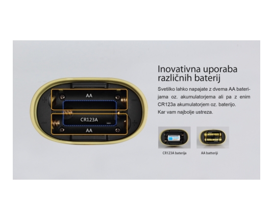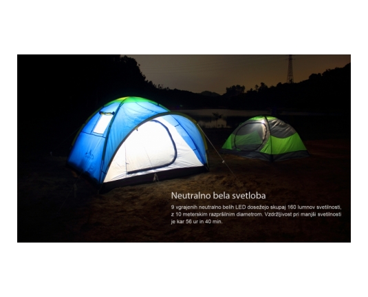 Napajata jo dve AA baterije ali ena CR123a litijeva baterija (uporabna predvsem za hladno okolje). Ima 9 neutralno belih LED in dodatno rdečo LED. Inovativna oblasta oblika omogoča optimalno osvetlitev.
