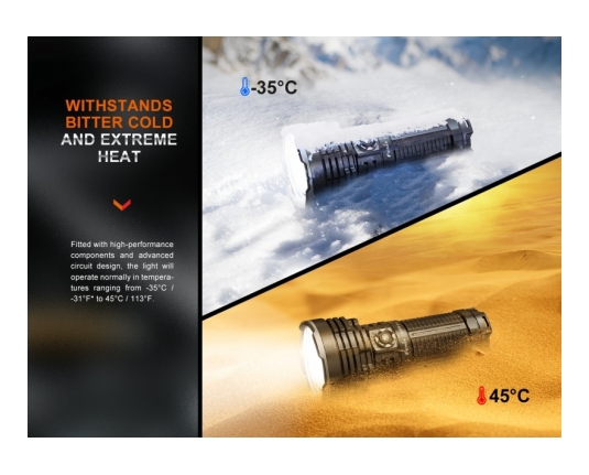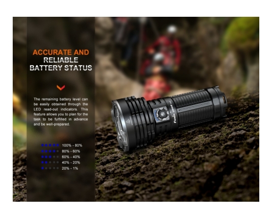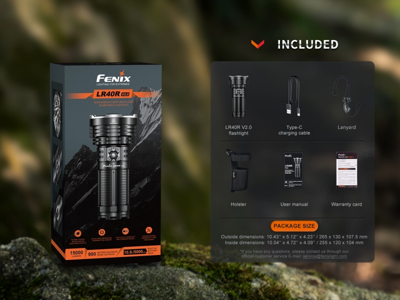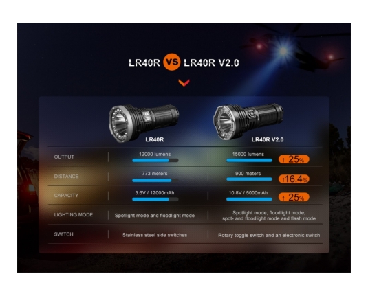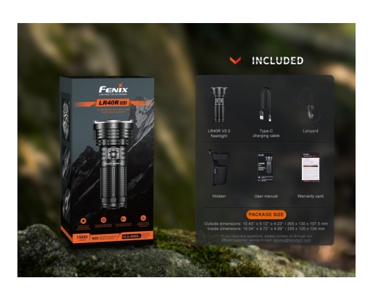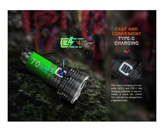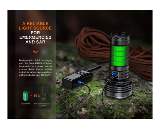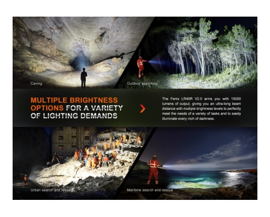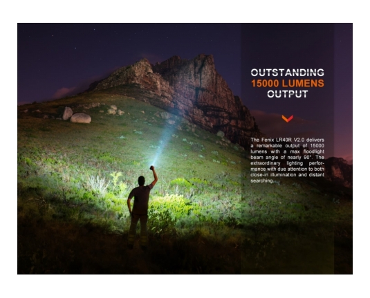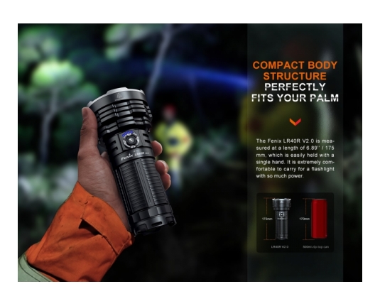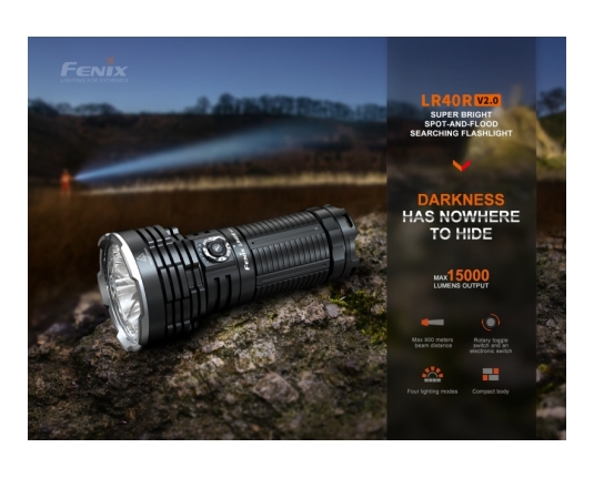 Fenix LR40R V2.0 je zelo zmogljiva polnilna ultra kompaktna svetilka, ki omogoča usmerjen in razpršeni snop in doseže neverjetnih 15000 lumnov svetilnosti. Ena izmed najmočnejših svetilk na trgu!