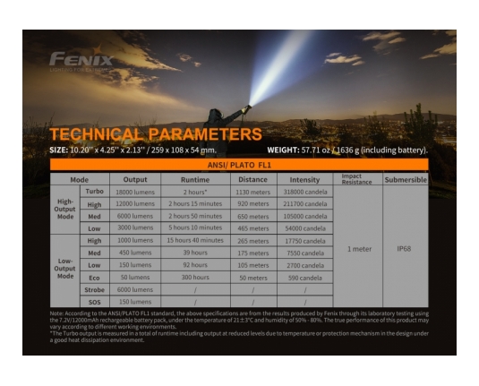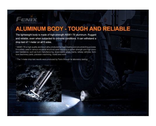 Zaradi izjemne svetilnosti in kakovosti je primerna le za profesionalno rabo. Izdelana je iz anodiziranega letalskega aluminija. Vodoodporna po standardu IPX-8. Svetilka ima ojačano ultra-čisto dvojno lečo z anti - reflektivno prevleko proti odsevu in Premium Type HAIII anodiziran premaz proti rjavenju. Prav tako ima elektronsko regulirano svetilnost in ročaj iz nedrsečega materiala. Napaja jo 16000 mAh akumulator.