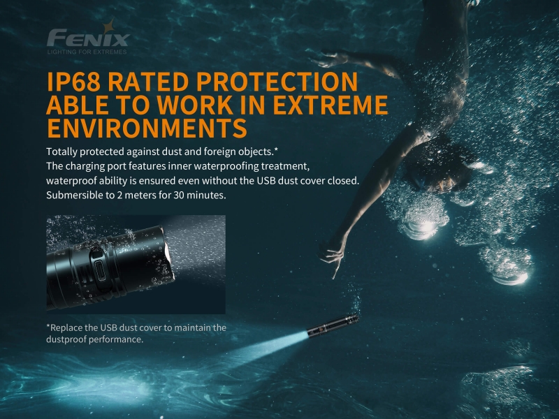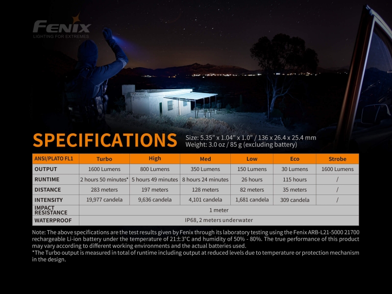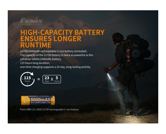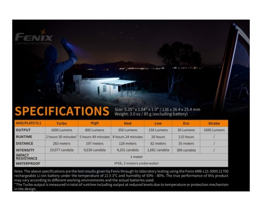 Snop svetilke doseže 283 metrov in uporablja 21700 Li-Ion 5000 mAh akumulator, zaščiten proti prenapolnitvi, preizpraznitve in preobremenitviji. Izdelana iz anodiziranega letalskega aluminija. Vodoodporna po standardu IPX-8. Svetilka ima ojačano ultra-čisto dvojno lečo z anti - reflektivno prevleko proti odsevu in Premium Type HAIII anodiziran premaz proti rjavenju. Prav tako ima elektronsko regulirano svetilnost in ročaj iz nedrsečega materiala.