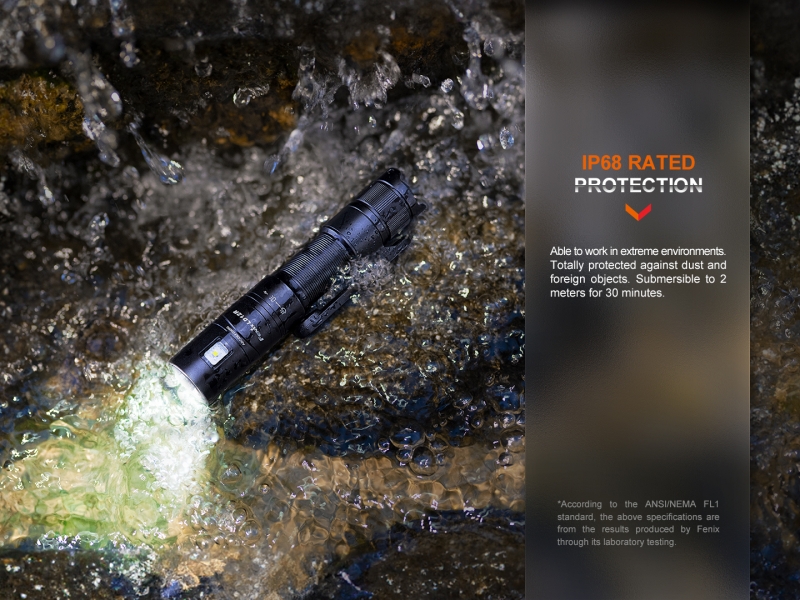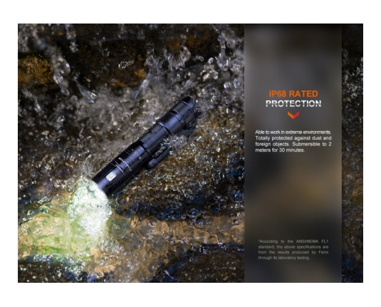 Izdelana je iz anodiziranega letalskega aluminija. Popolna zaščita po standardu IP68. Svetilka ima ojačano ultra-čisto dvojno lečo z anti - reflektivno prevleko proti odsevu. Prav tako ima elektronsko regulirano svetilnost in ročaj iz nedrsečega materiala.